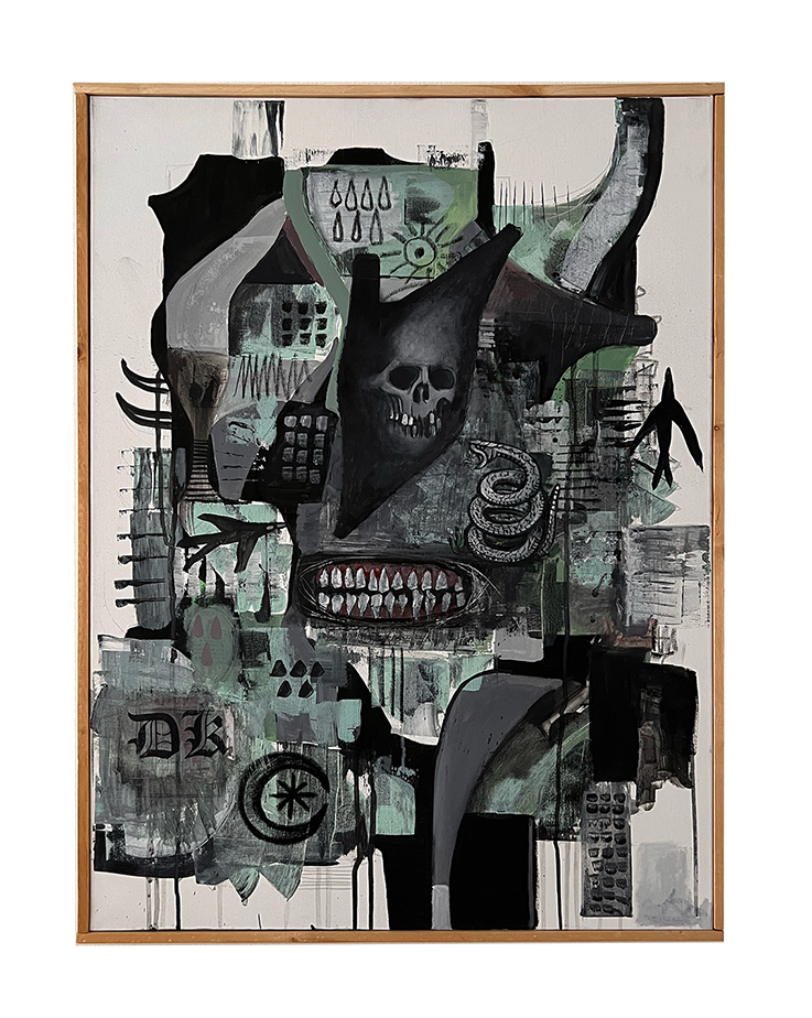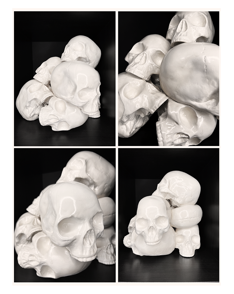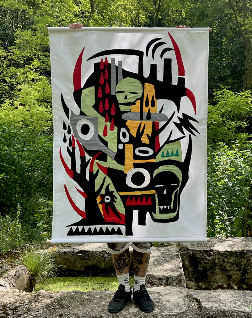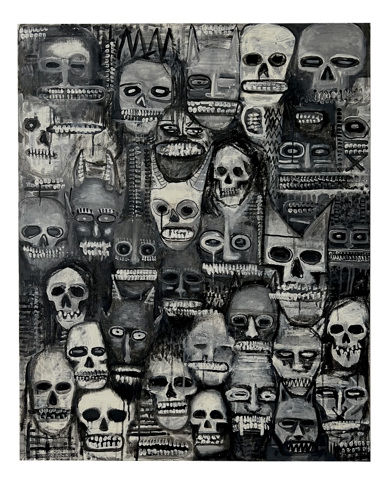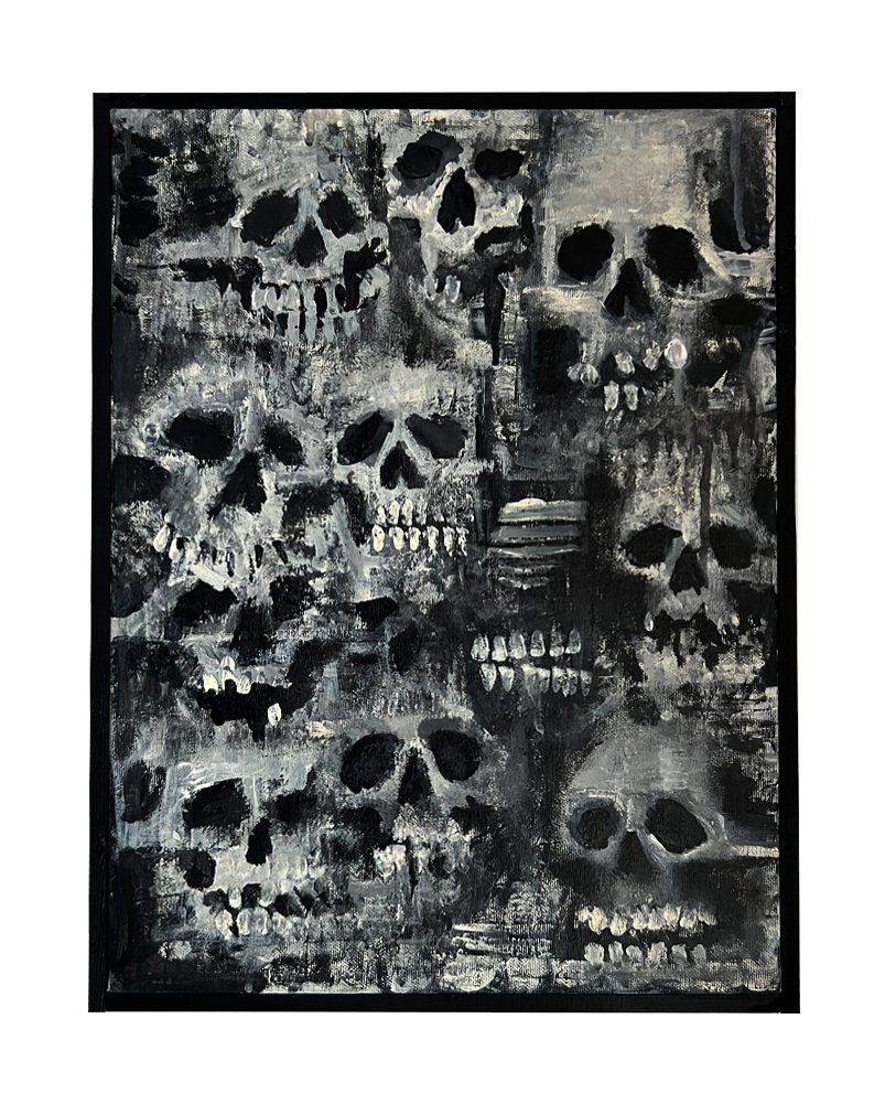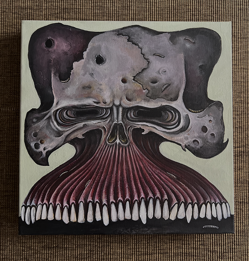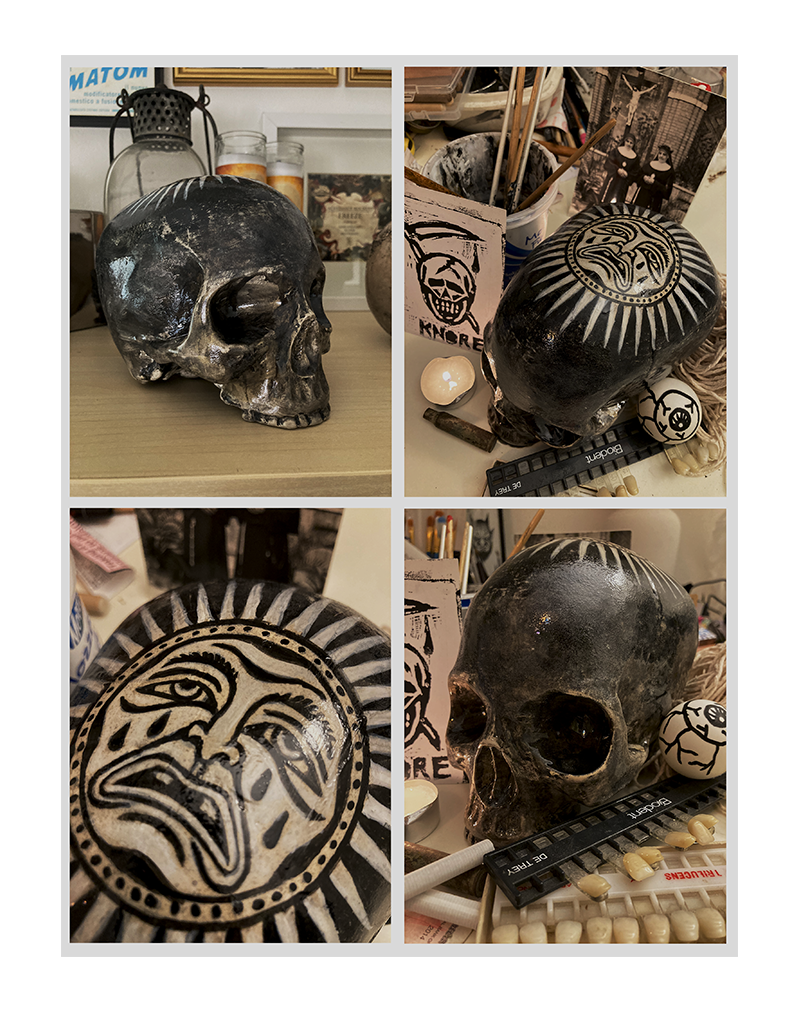 OMEN – Opera in tessuto – 90×130 cm 2026OATH – Opera in tessuto – 90×130 cm – 2026 SOLDNatura morta – Opera in tessuto – 90×130 cm – 2025 SOLDDark forest – Tecnica mista su tela – 70×100 cm – 2025Teschio N.1 – Acrilico su tela – 30×30 cm – 2025 SOLDTeschio N.2 – Acrilico su tela – 30×30 cm – 2025Domestic riot – Acrilico su tela – 60×80 cm – 2024Manuale per una catastrofe lenta – 60×80 cm – 2024Bored – Acrilico su tela – 60×80 cm – 2024Una lunga attesa – Acrilico su tela – 100×120 cm 2023 Ossario – Acrilico su tela – 30×30 cm – 2023Totem – Ceramica – 30×32 cm – 2023Buried – Teschio in ceramica sepolto per 365 giorni – Ceramica/Terra/Erba – 2023 SOLDTeschio – Ceramica – 2023 SOLD